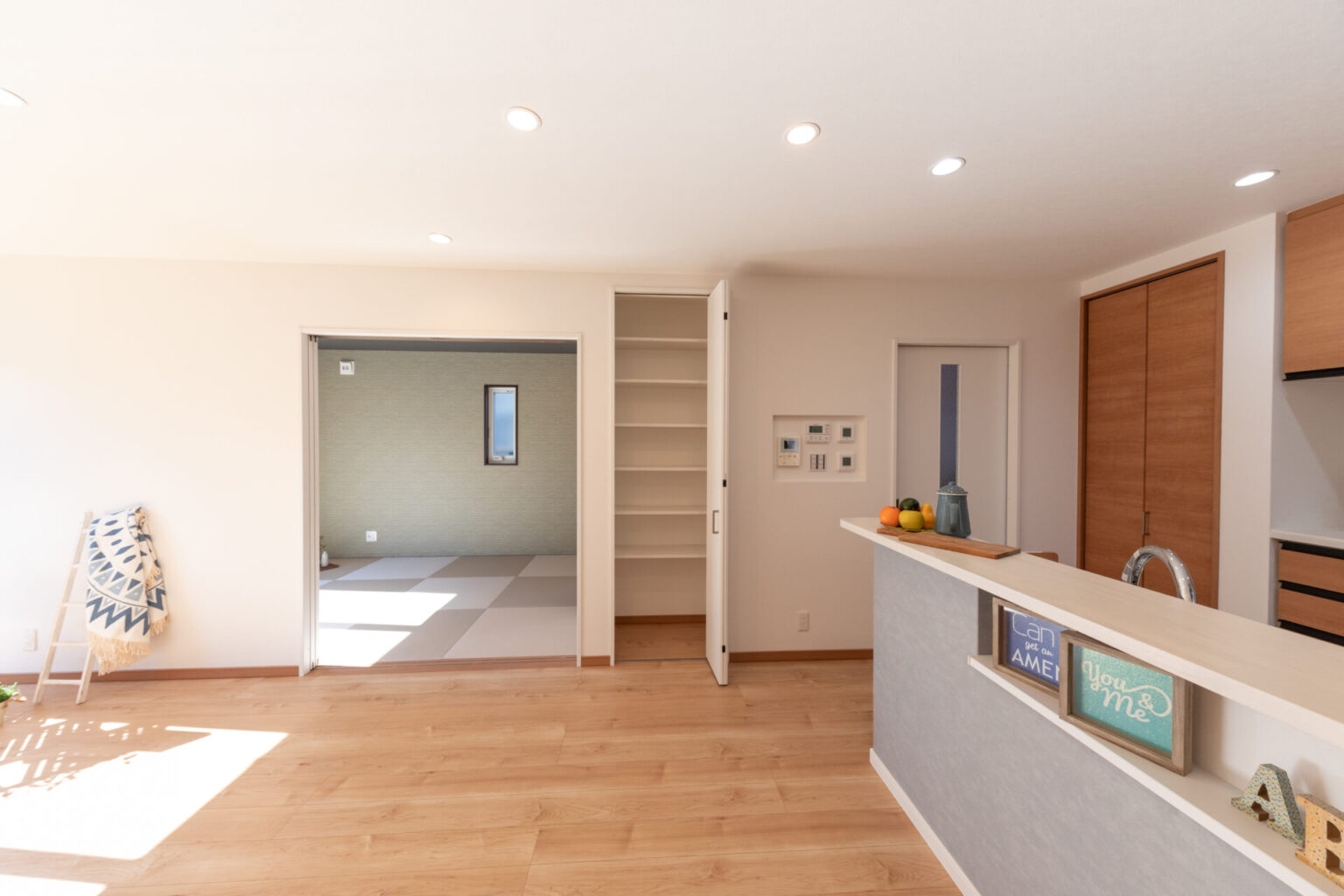 「日当たり良好」で「家事動線抜群」な施主様の”こだわり”がたくさん詰まったおシャレでコンパクトなお家です。 日々の生活を楽しく過ごすには、一番長くいる場所が大切です。 T様邸のリビングダイニングは日当たりも抜群で日中は照明を付けなくてもとっても明るい空間となっています。 リビングダイニングを中心に動線が広がっているのも生活するうえで大切なポイントですね。