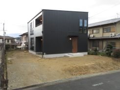 外壁は、正面はブラック色の金属系サイディングで、その他の面を窯業系サイディングで貼り分けています。