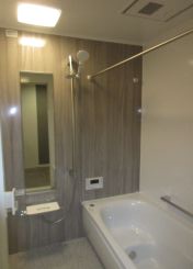 木目のアクセントパネルの浴室です。