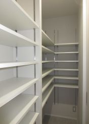 キッチン横にあるパントリーは、引違い戸で普段は隠すことができ、扉を開けるとL型に可動棚が設置されていて収納力も抜群です。