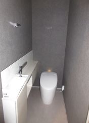 タンクレストイレに手洗いキャビネットのあるトイレです。