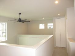 コの字の手摺壁に囲まれた吹抜けが見える開放的な2階ホールです。
