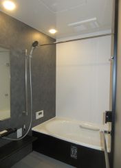 浴槽エプロンやカウンターもブラック色で配した浴室です。