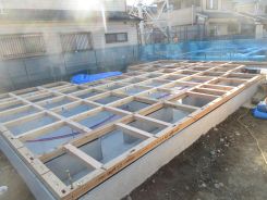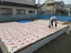 建て方当日までに、土台・大引伏せ、床断熱敷設、床合板張りと外部足場組立まで、済ませておきました。