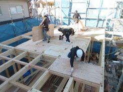 1階柱・2階梁と順に建込みし、床合板を貼っていきます。