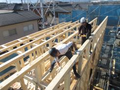 小屋梁まで掛け終えたら、小屋束を建て、母屋・棟木を掛けてから、垂木を掛けて屋根下地の合板を張っていきます。