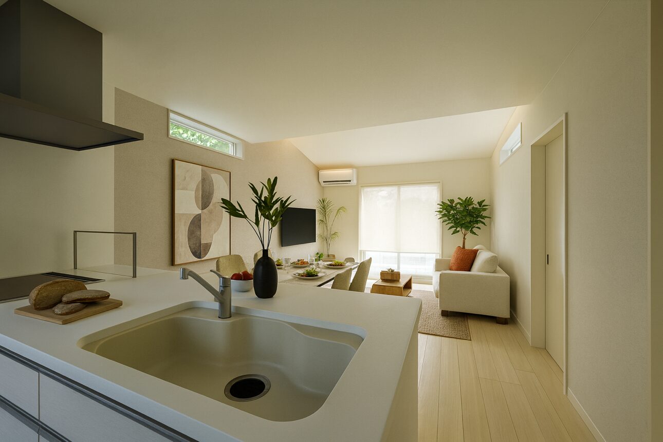 キッチンからダイニング・リビングまで視線が抜け、家族の気配がいつも近くに感じられます。
