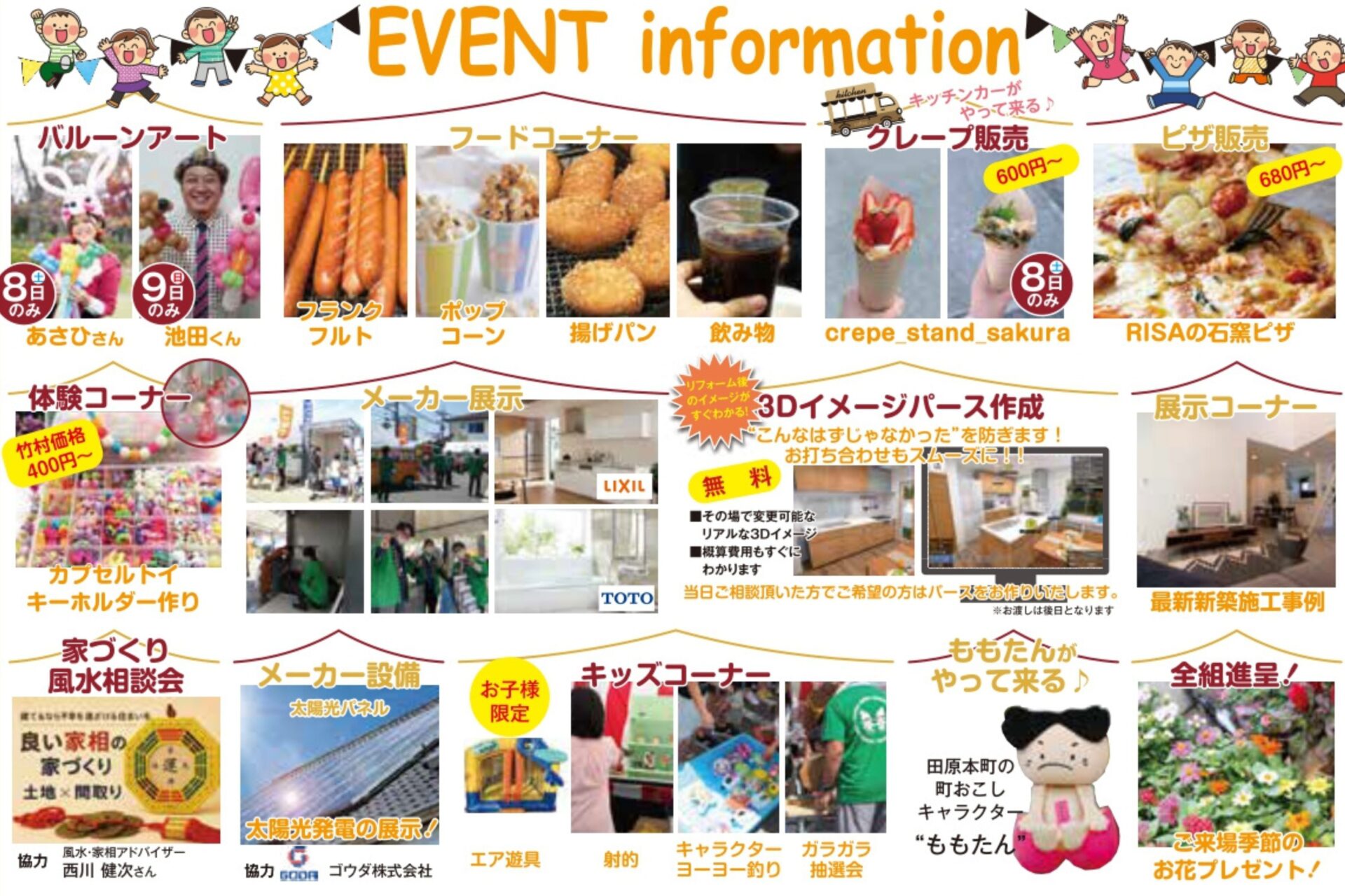 13のフードコーナーやキッズ体験コーナーから、感謝価格の土地・モデルハウス販売会、そして最大70%オフのリフォーム販売会など2日間だけの企画が盛りだくさん!