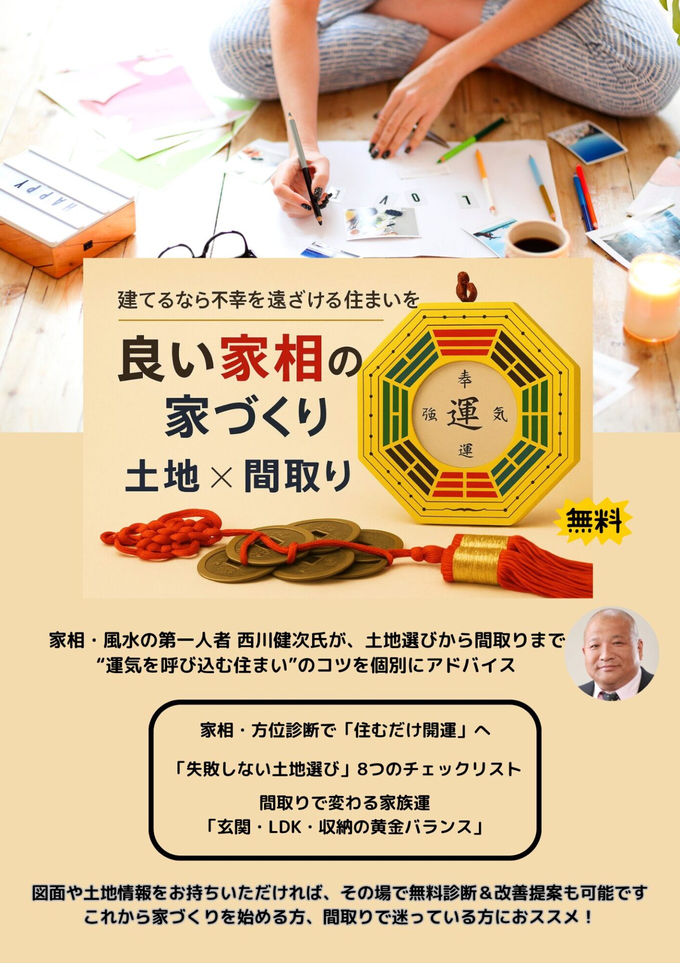 方位診断や土地選びのチェックリスト、家族運を高める間取りなど、実践的な内容を無料でご案内。