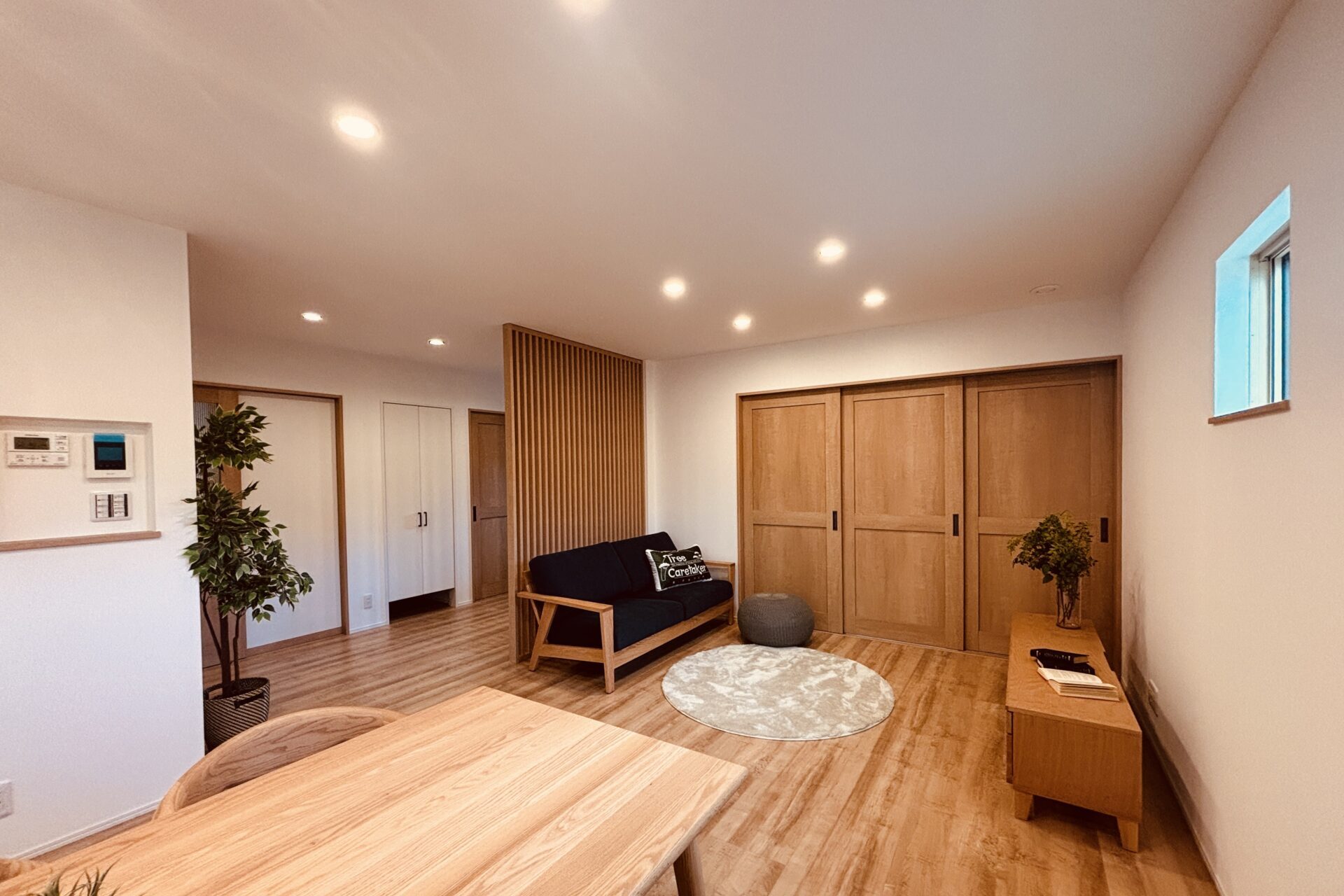 エアコン1台で、夏は涼しく冬は暖かい空間を実現しました。デザインの美しさと、圧倒的な快適性を両立した自慢のお家です。