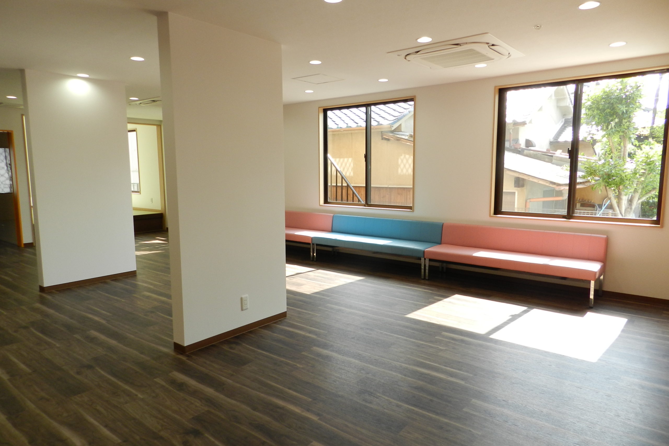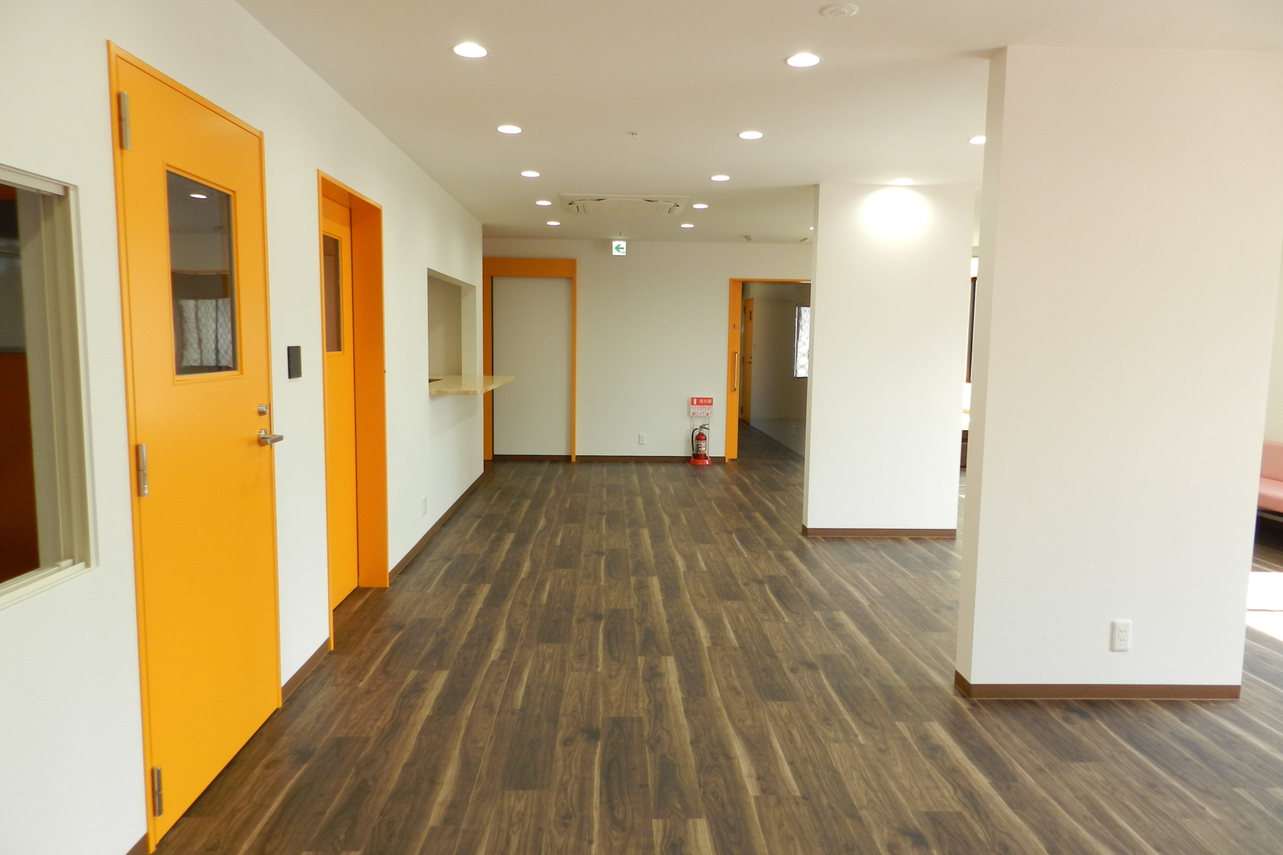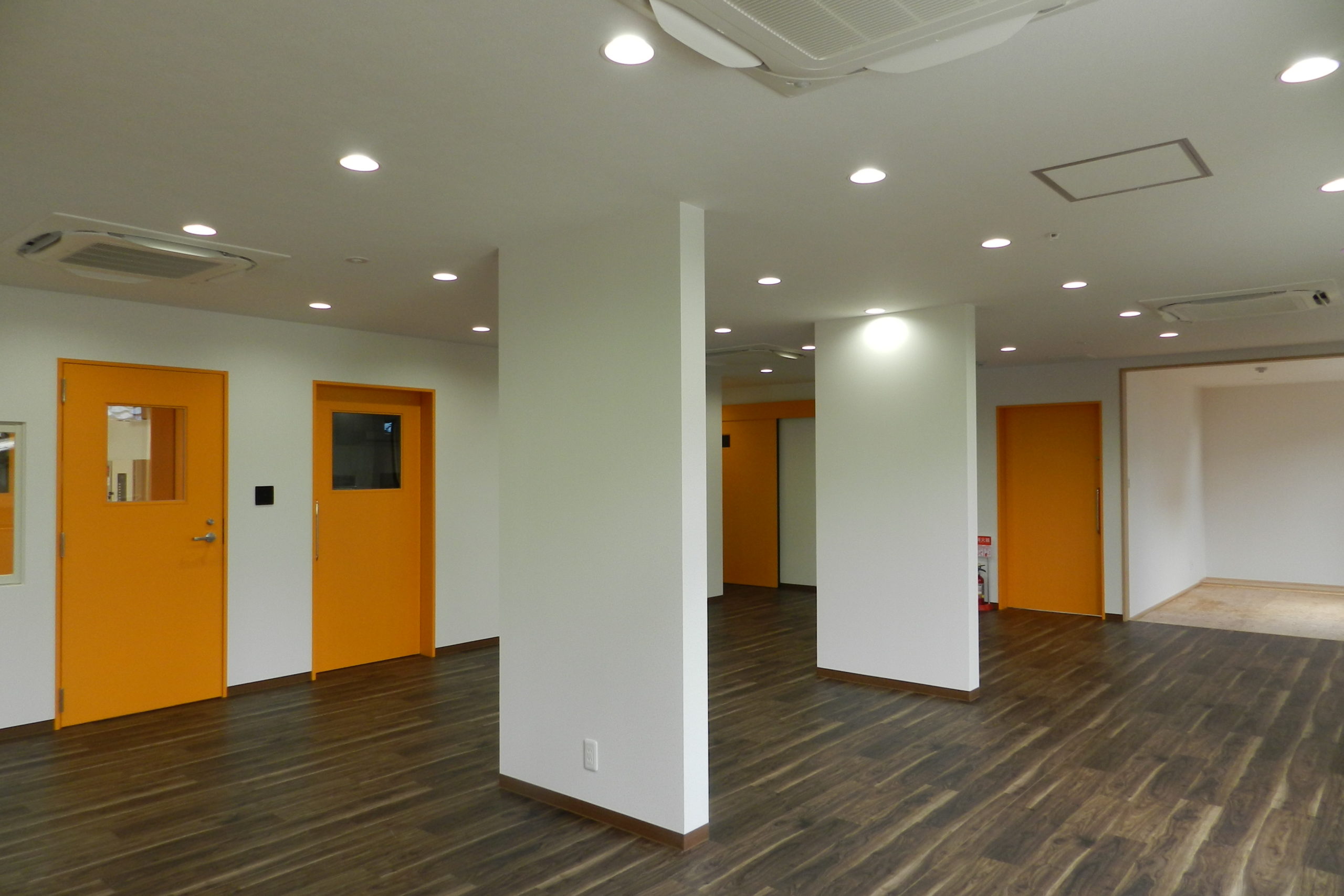 障害を持った子供たちを受け入れる、民間の社会福祉施設の建築工事でした。 それまで運営されていた施設では宿泊者を受け入れるスペースがほとんどなく、できるだけ多くの子供様がショートステイできるような設計がご希望でした。 管理スペースを中央に配し、日中も夜間も安全第一に管理ができるようにと考えて設計させていただきました。