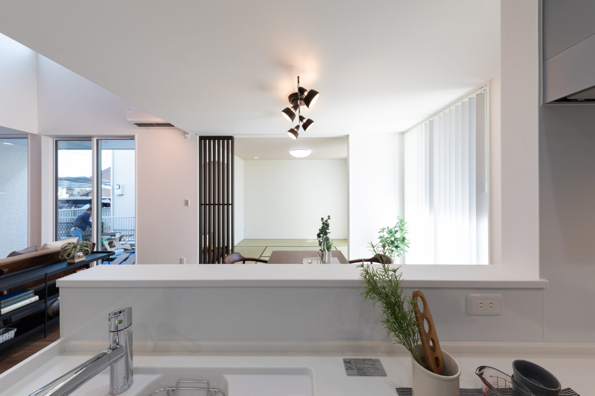 LDKだけで23帖!続き間の6帖和スペースや吹抜けも採用することで、明るく広々とした居住空間を実現しました。 さらにお隣からの視線が気にならないようにプライバシー確保にも工夫が♪ デザインの最大の特徴は、これまでの家に比べて視覚的要素が圧倒的に少ないシンプルなデザインになっていること。 快適さや暮らしやすさを保ちながら、不要なものを取り除いていき、「カッコ良さ」と「住みやすさ」の共存を可能にします。