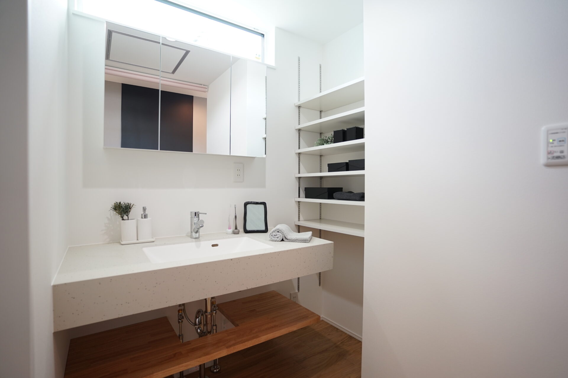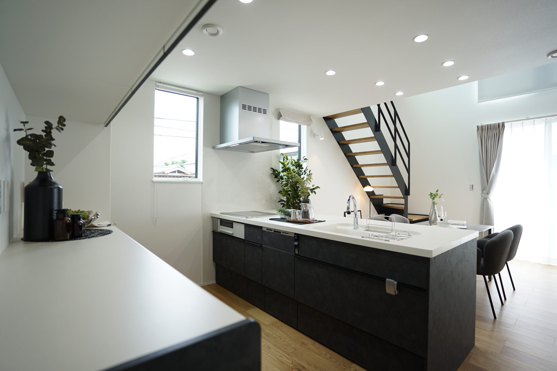 開放的な吹抜けとスタイリッシュなアイアン階段 清潔感を感じる大人可愛い部屋に仕上がりました! 主婦の味方となる工夫のある間取り 廊下のないコンパクトな動線と室内干しスペース 1Fにウォークインクローゼットがあるのでワンフロアで家事が完結