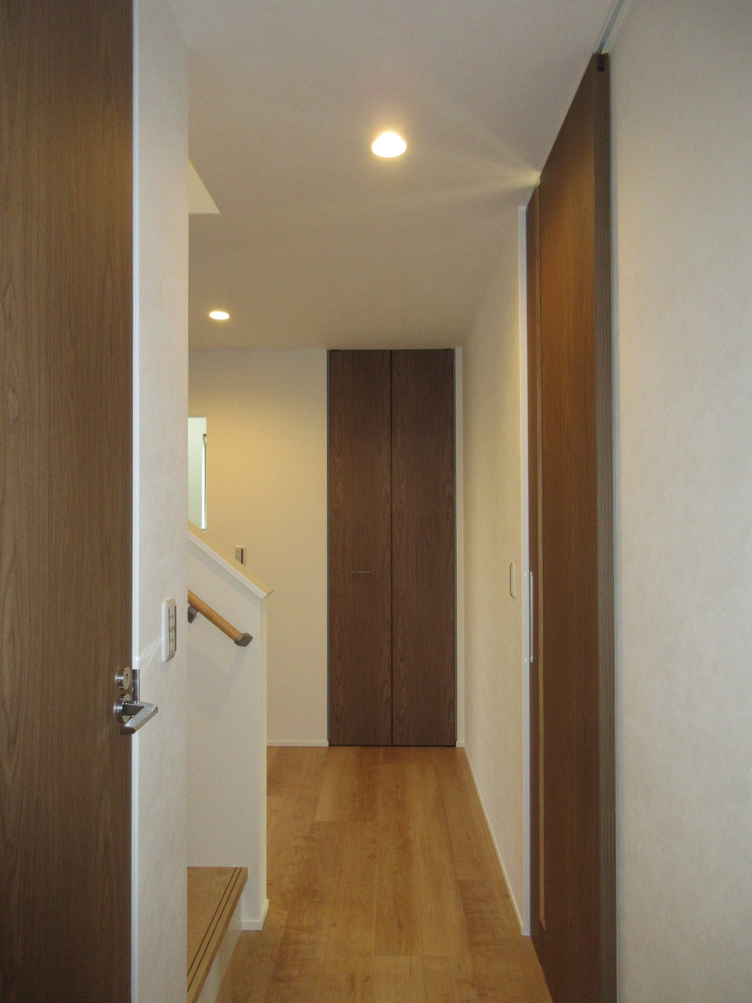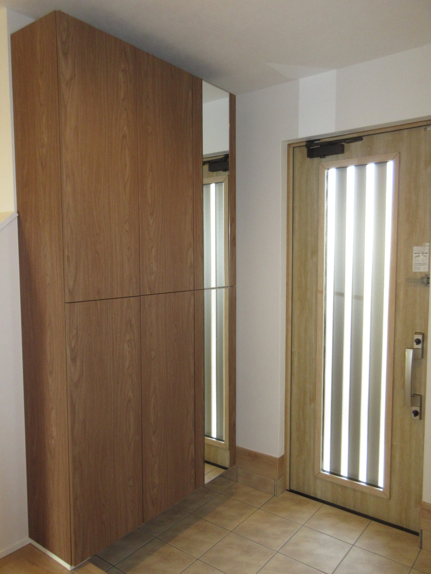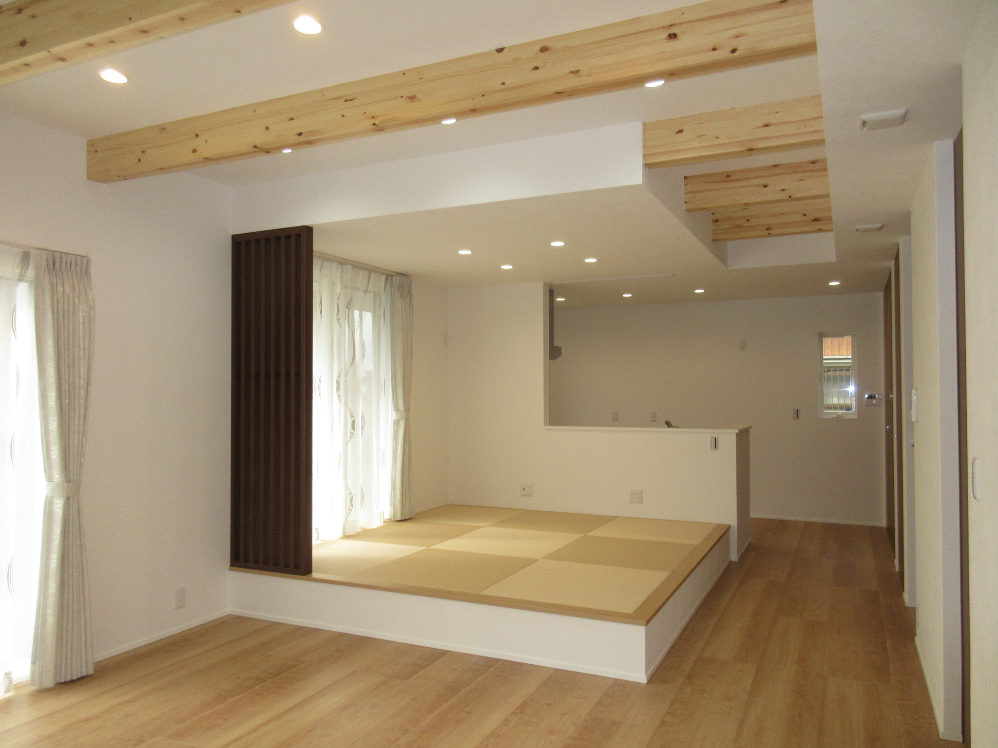 天井まであるフルハイドアと、リビングの表し梁を出すことで開放感を演出しています。 また、ダイニングテーブルを置かず、キッチン前に畳コーナーを設け、座って食事をするというスタイルもお客様のご希望の1つでした。