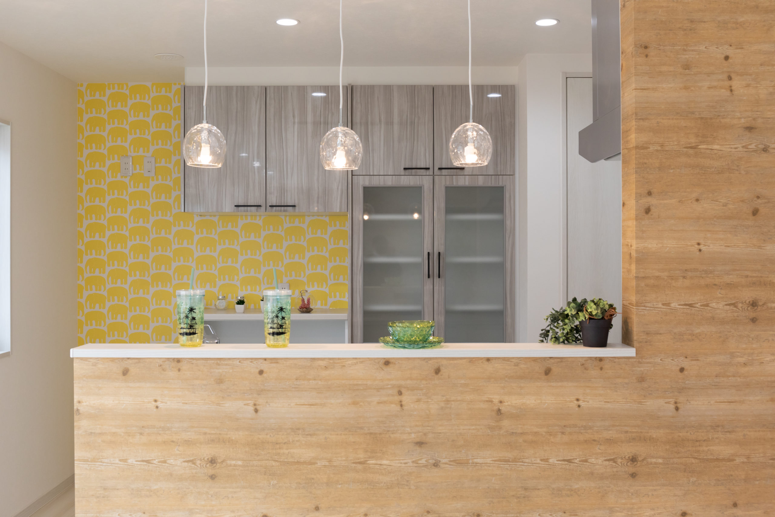 キッチン後ろの壁紙は黄色のアクセントカラー。