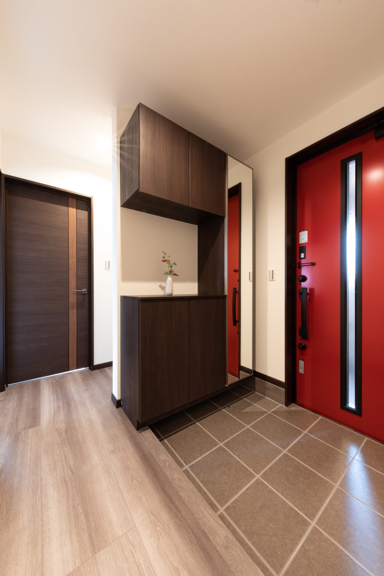 ①ご夫婦の趣味を生かした大胆な間取り設計 ②やっぱり快適2階リビング ③ホールからはリビングルーム、洗面所、主寝室へとアクセス また夏は涼しく、冬は暖かい。快適なお家。 高気密・高断熱 Ua値は0.46、C値は0.44のとても優れた性能です。 光熱費が削減できる太陽光13.12kwを搭載しています。