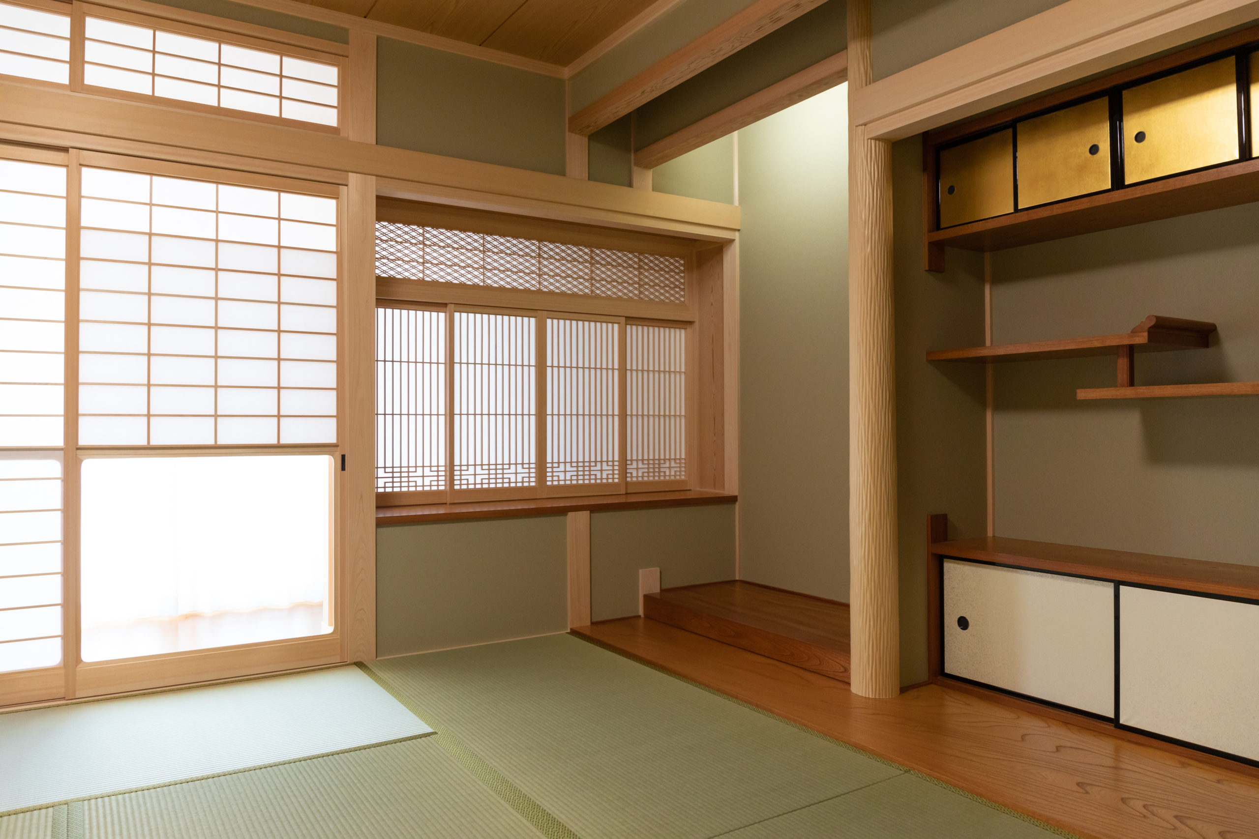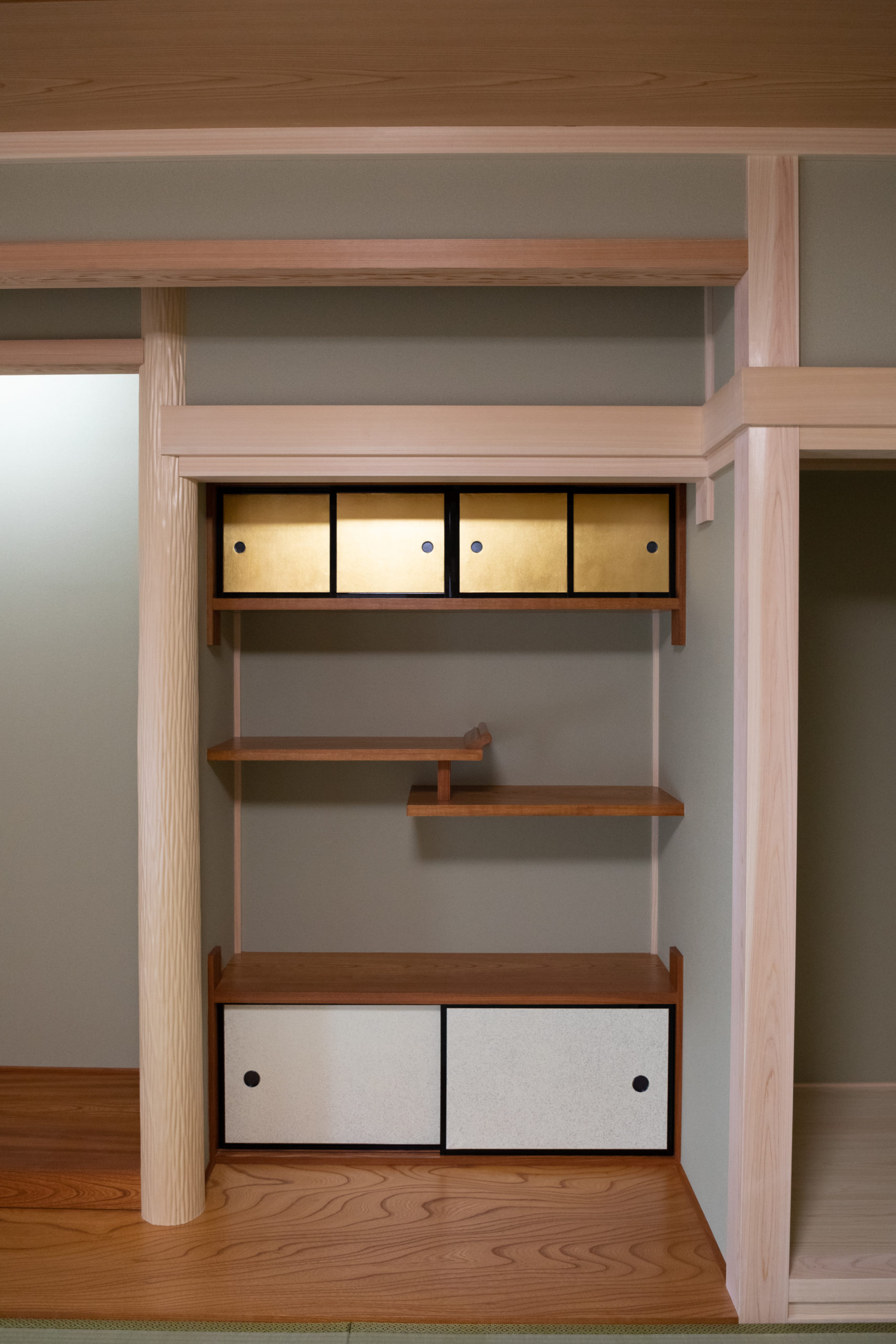 N様邸の床の間は「床の間」「違い棚」「書院(付け書院)」の3点セットで構成されています。