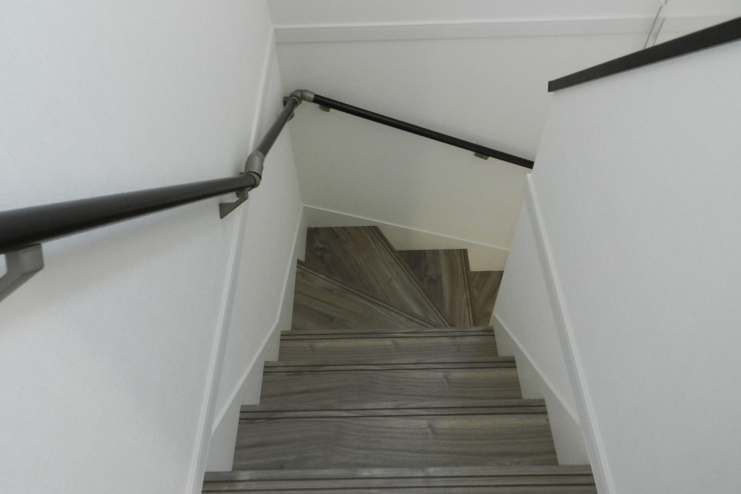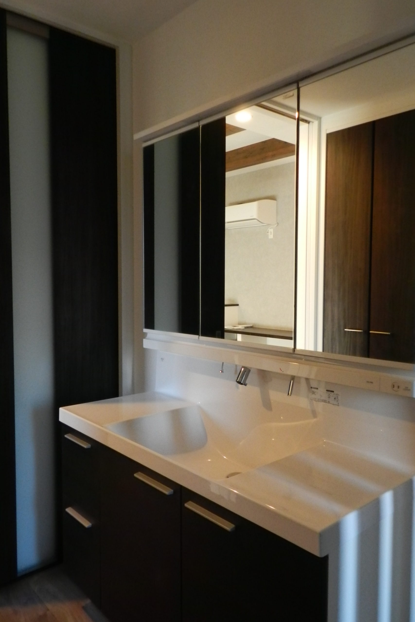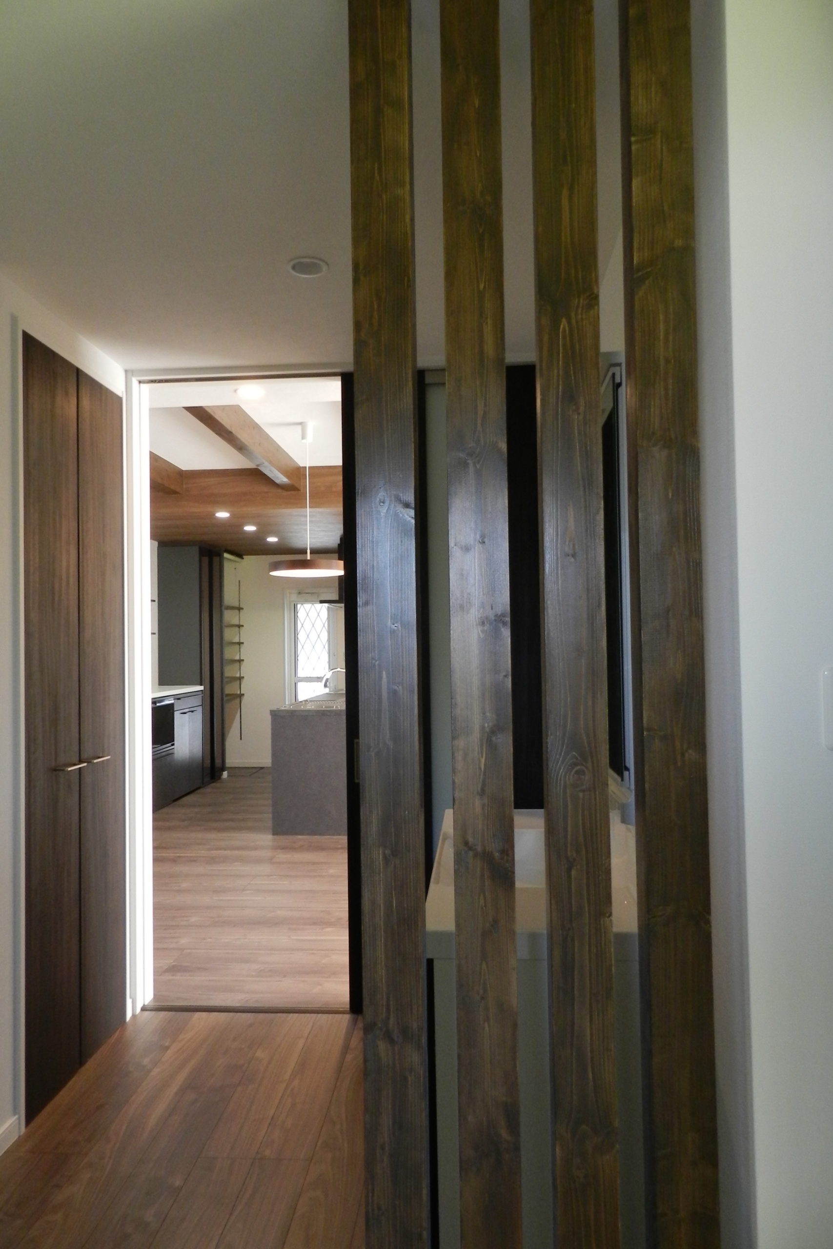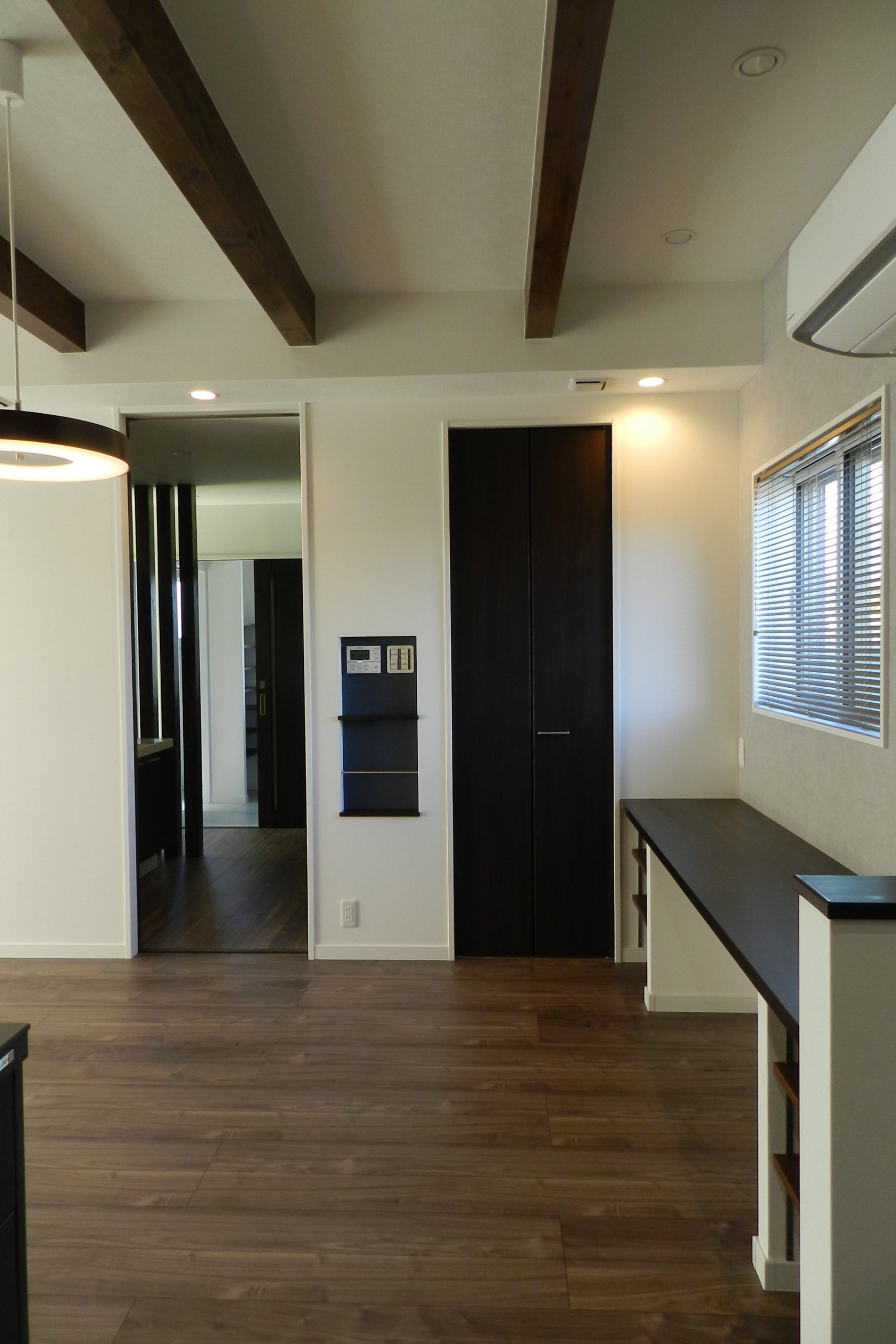 内装は、ブラウンを基調に、落ち着いたカラーでまとめ、キッチン上の天井を一段下げて木目にすることでアクセントになっています。