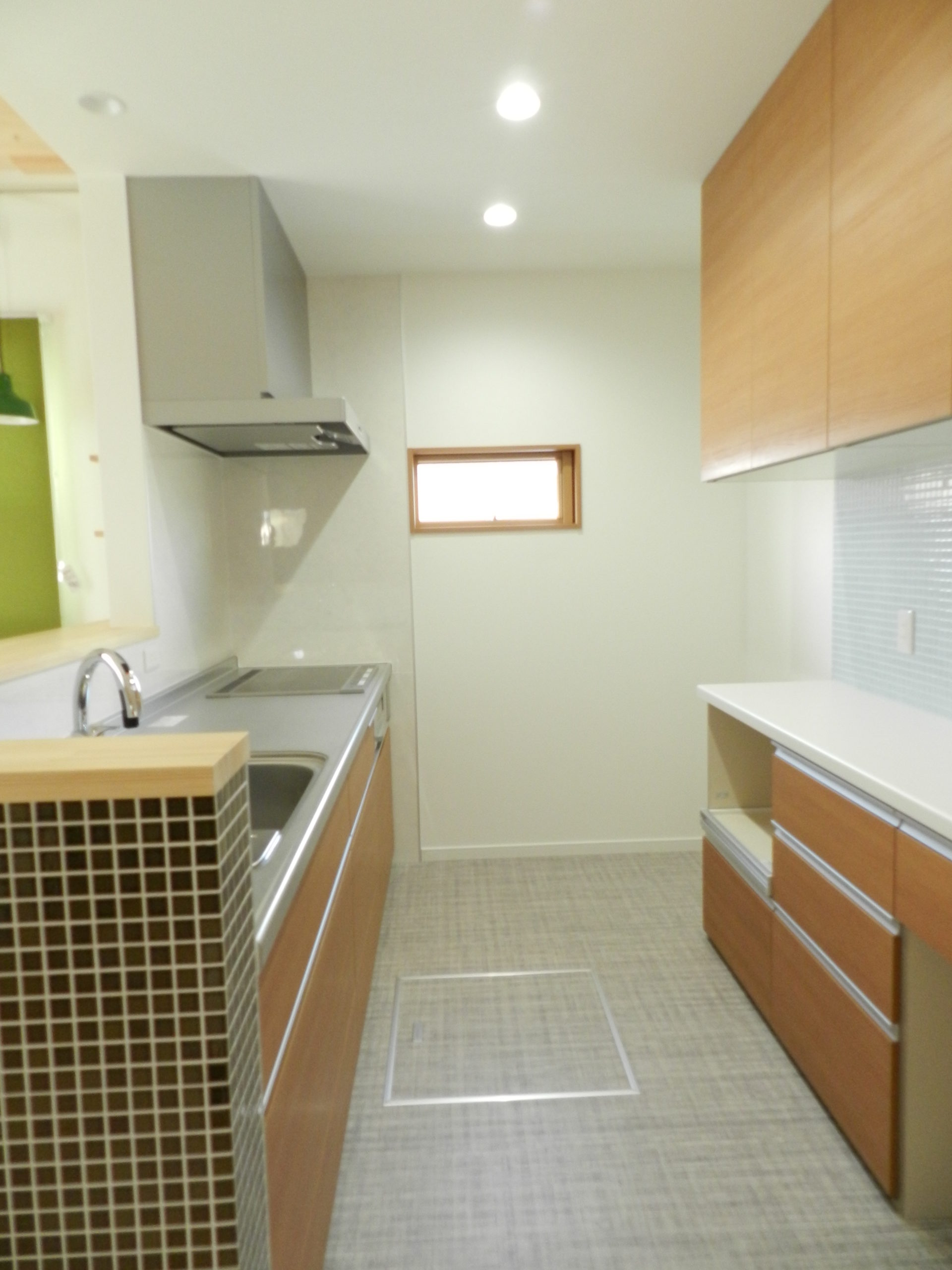 キッチンまわりはアクセントでモザイクタイルを貼っております。