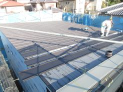外部では、屋根ガルバリウム鋼板葺きを行い、外壁サイディング貼りを行いました。