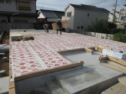 建て方当日までに、土台・大引伏せ、床断熱敷設、床合板張りと外部足場組立まで、済ませておきました。